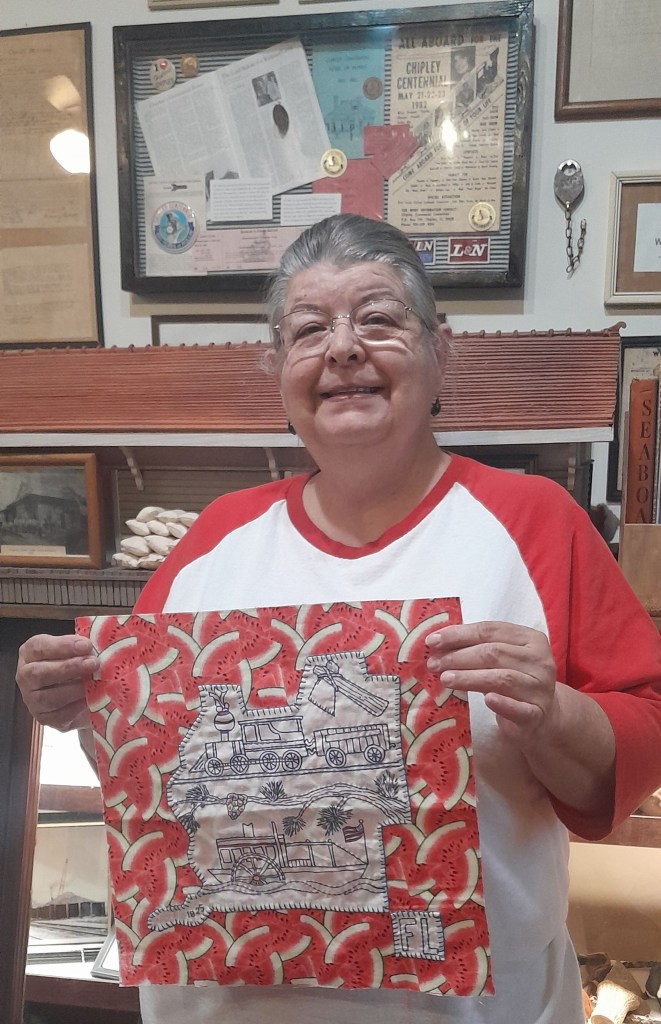 The square was designed and made by Gweneth Collins, a long-time historical society member. Washington County, FL was once known as the Watermelon Capital of the world and they still host the Panhandle Watermelon Fest every June. The railroad was very important to the county’s development and, at one time, river and steam boats carried, not only passangers, but turpentine, cotton, timber, and other goods on the Choctawhatchee River and Holmes Creek. The axe represents the Native Americans in the area (Creek by tribe). It is also a “nod” to George Washington and the cherry tree. In 2025 the county celebrated their Bicentennial, thus 1825 on the tail.