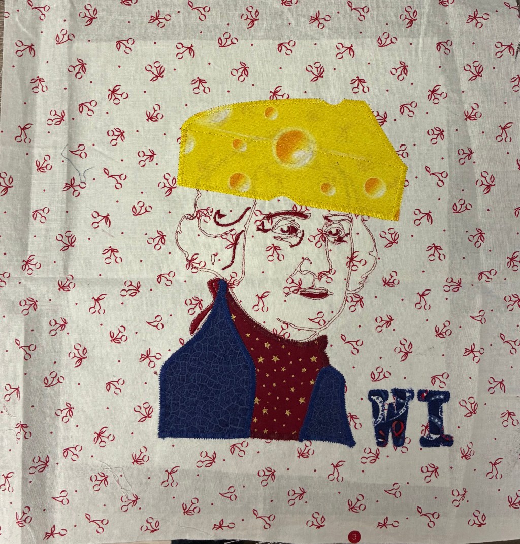 We began our planning by looking at the image of George Washington. Many of them showed him wearing a tricorn hat. Somehow that led to the idea of a cheesehead also being a tricorn and this is the result. (There may or may not have been some brandy old fashioned being consumed during the planning stage, but I’m not admitting anything.)There were also suggestions that he have a speech bubble with the words “Say Cheese” or “Tell your folks I said hi” (a nod to Wisconsin comedian Charlie Berens). We were uncharacteristically conservative and left that off. Carol Pasprzak did the embroidery and Colleen Terry did the applique.